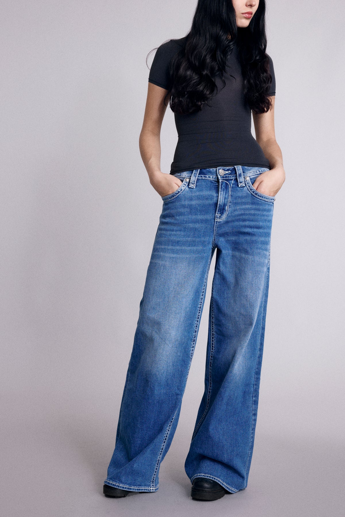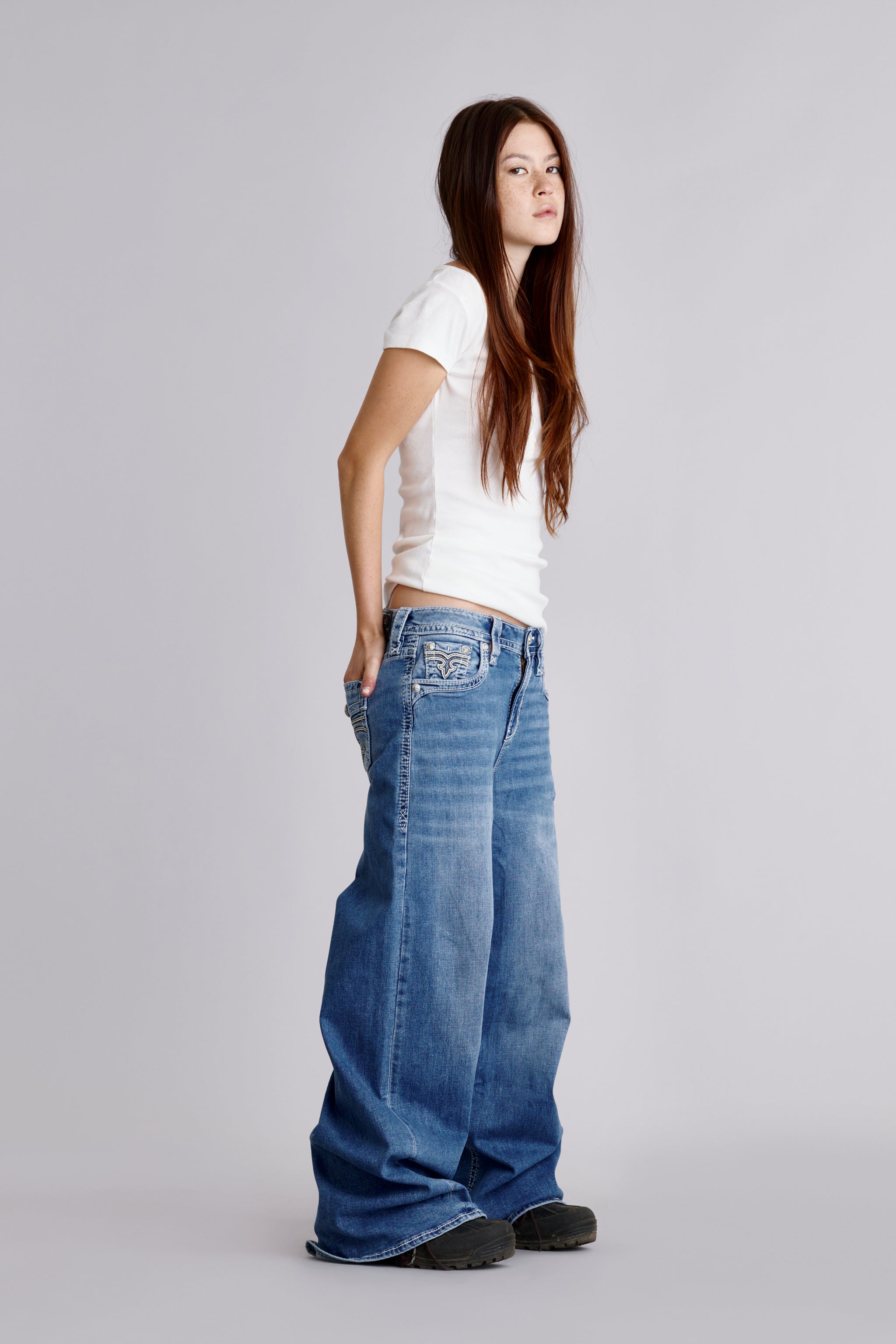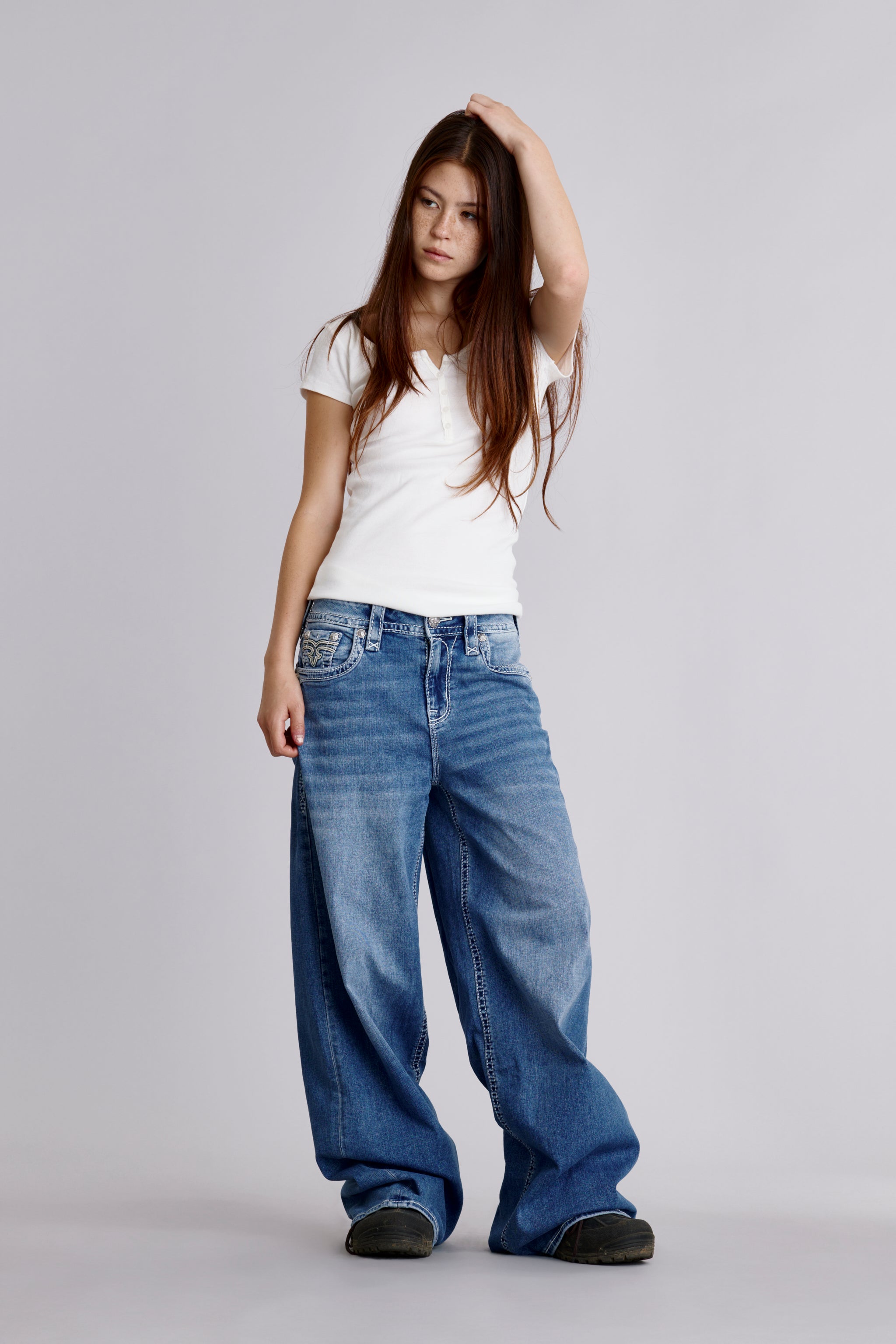 Alivia Oversized Wide-Leg Jeans by Rock Revival feature an ultra-relaxed, voluminous silhouette crafted in a soft medium wash and designed in Los Angeles.