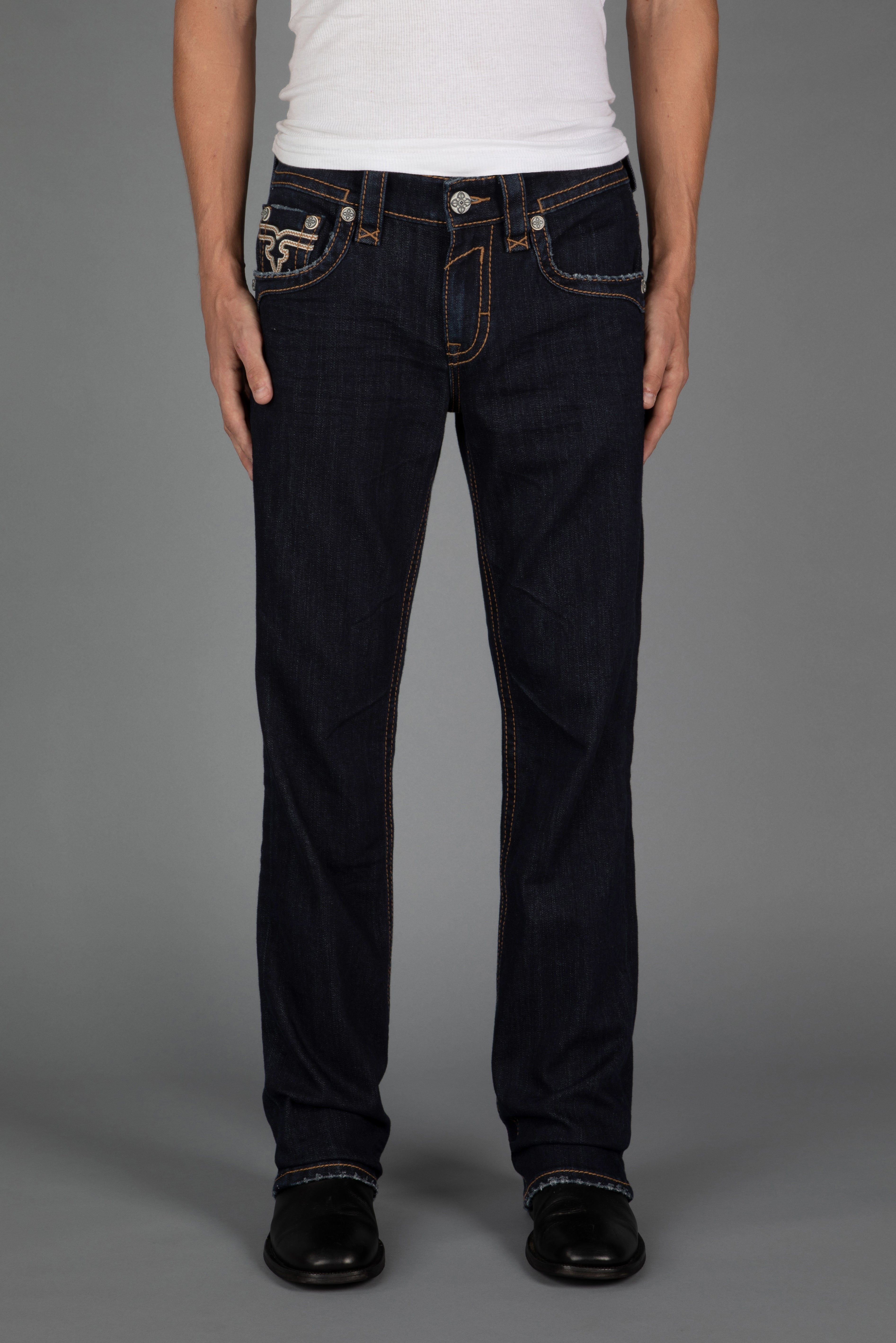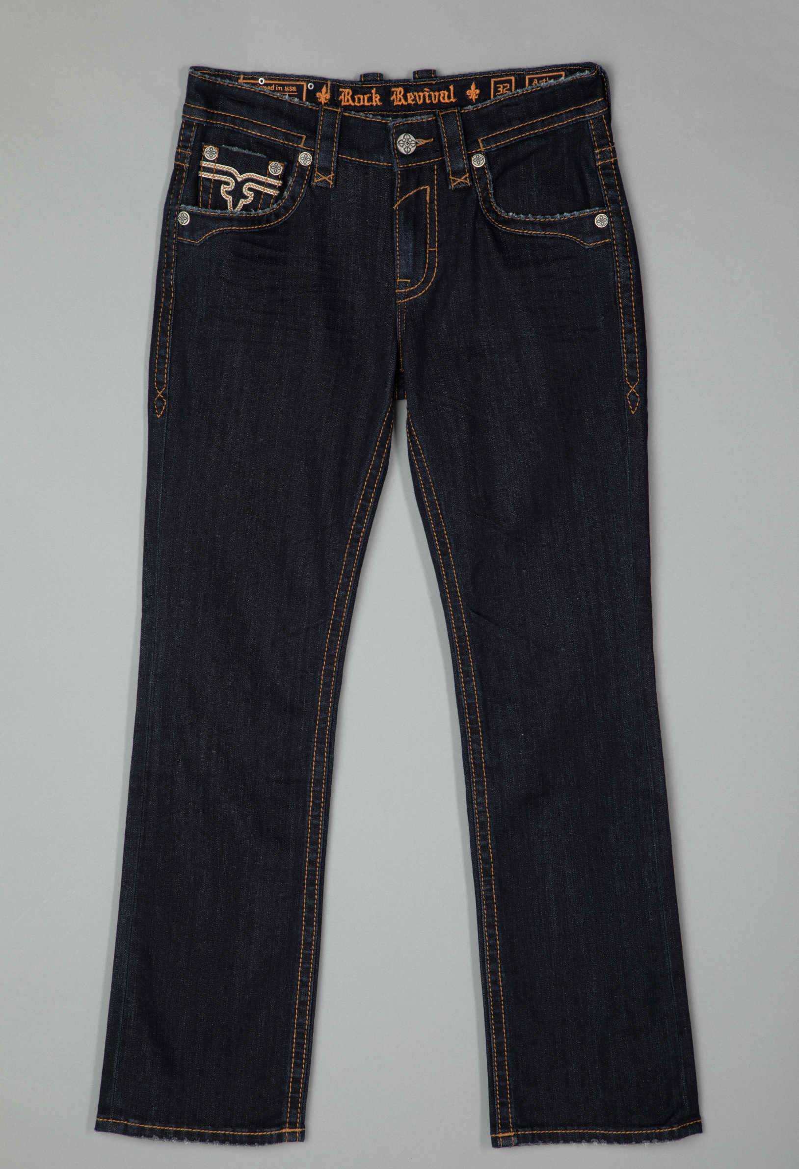 Arther Bootcut Jeans by Rock Revival with a straight silhouette crafted in a dark wash, designed in Los Angeles.