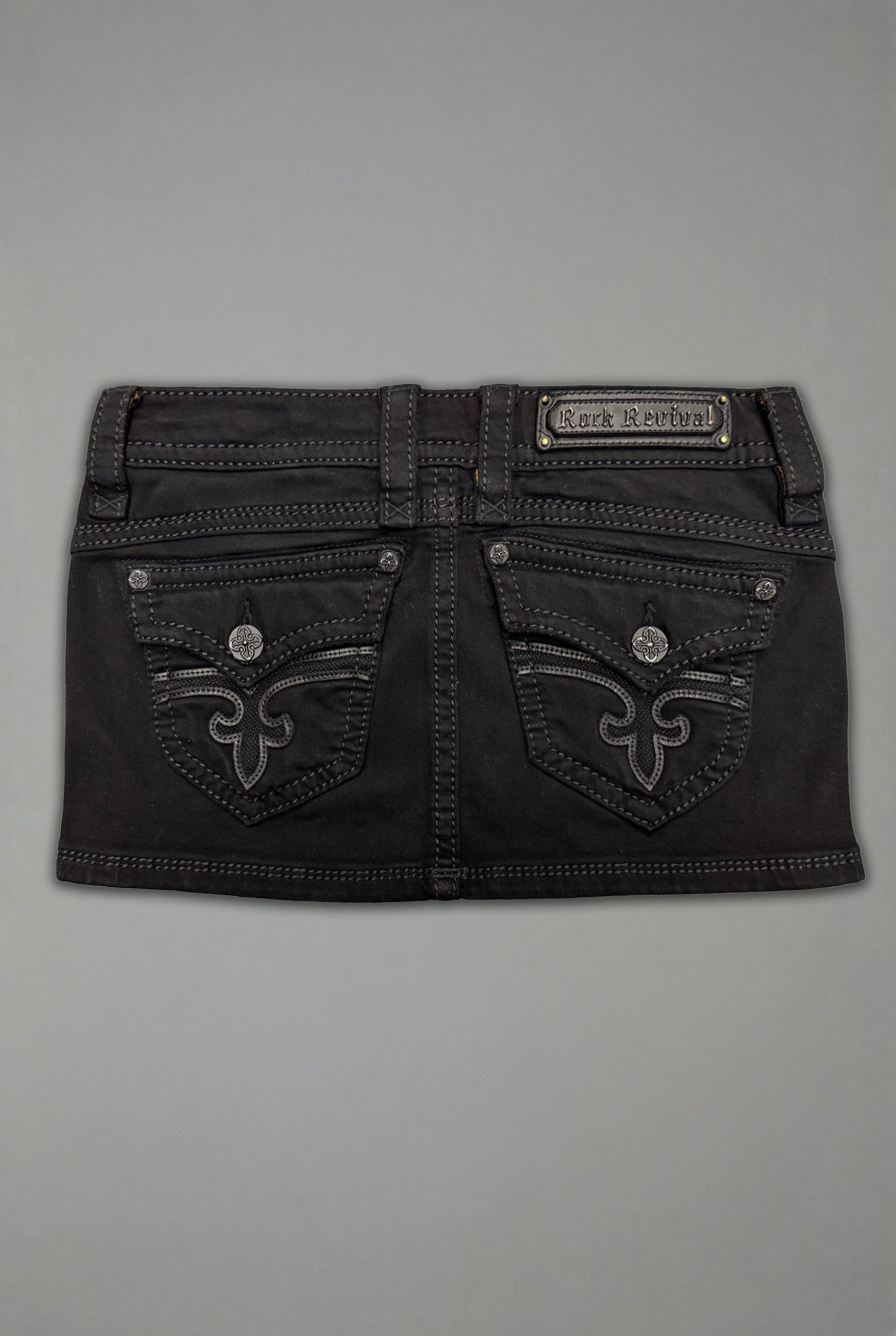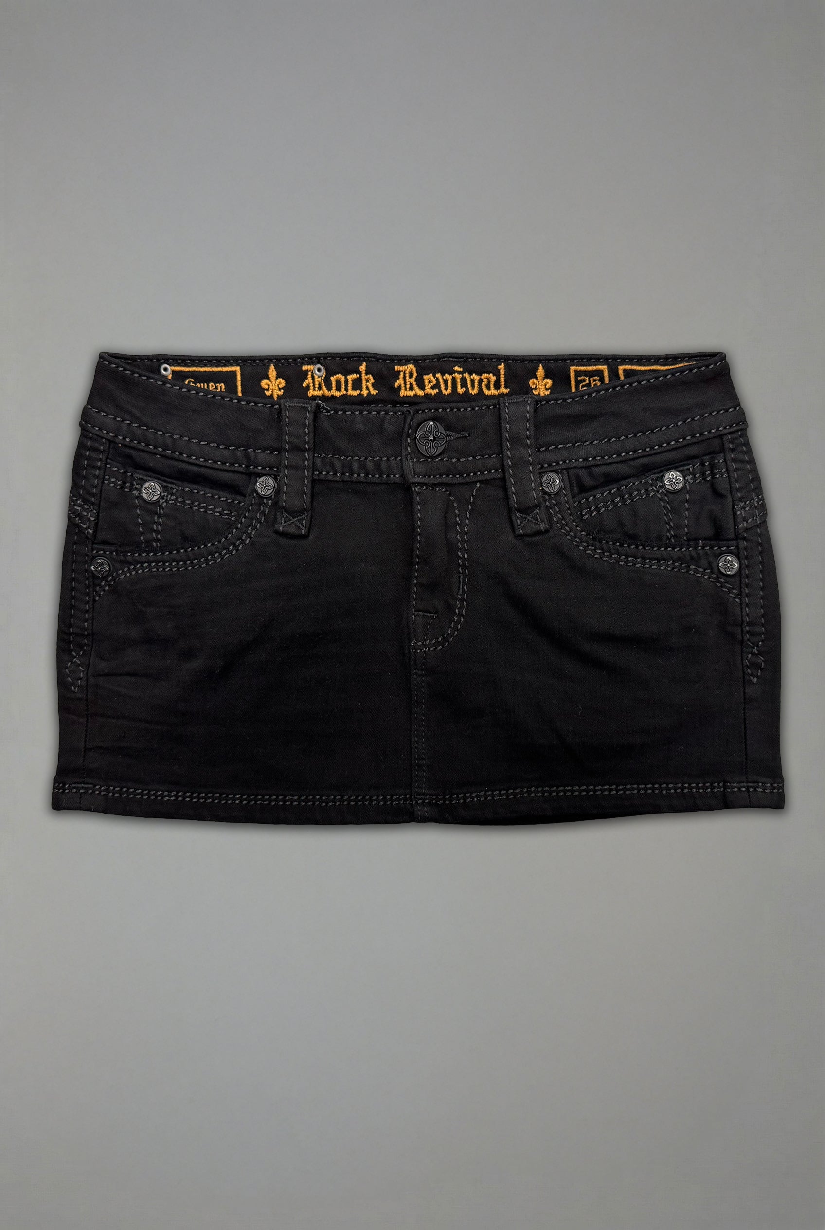 Gwen Super Low-Rise Mini Skirt by Rock Revival features a super low-rise crafted in a black overdye wash, designed in Los Angeles.