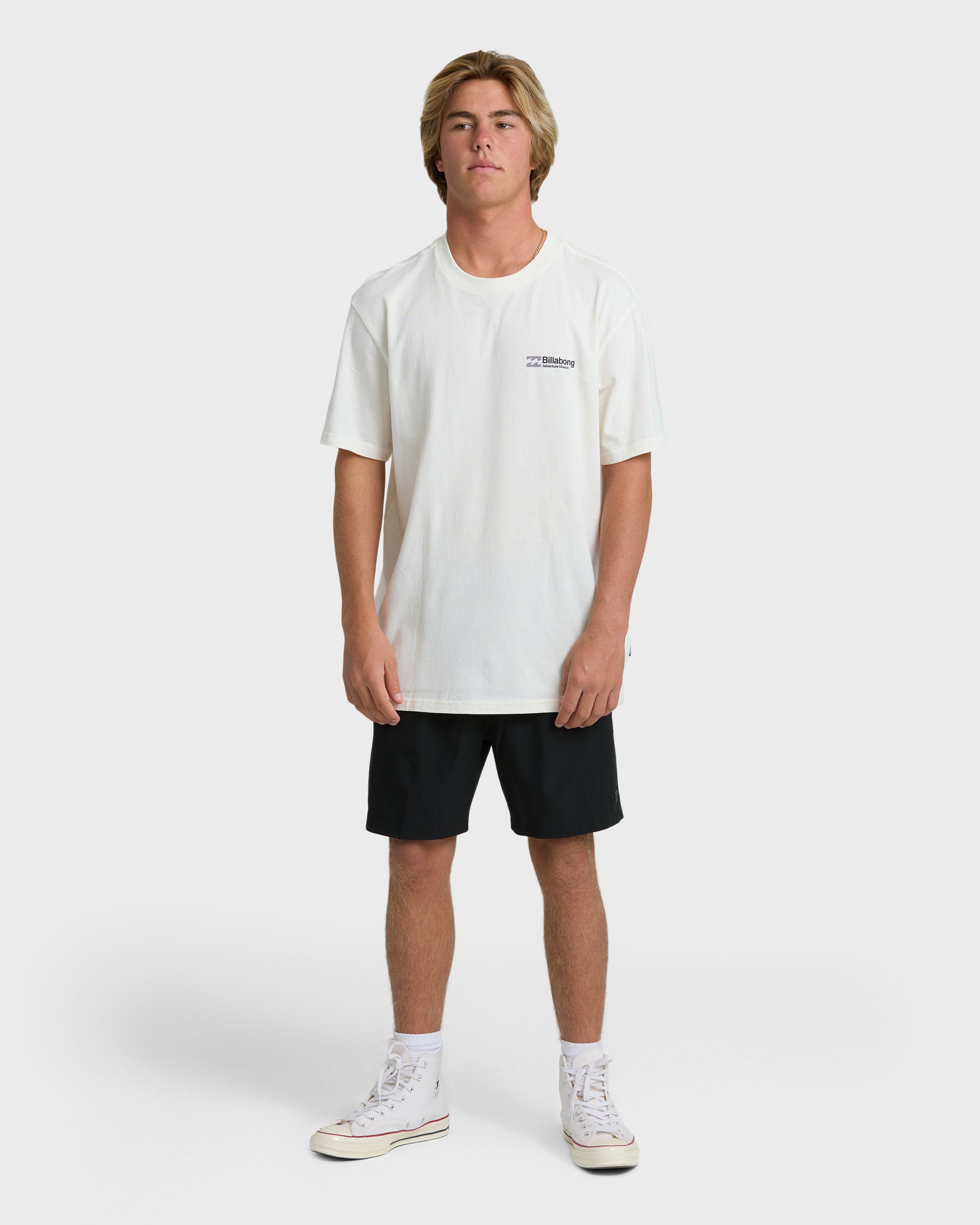 Our Make Tracks Adiv Premium Short Sleeve T-Shirt in Off White adds a clean basic to your everyday look. Crafted of 100% cotton for comfort and strength, the soft hand screen print adds subtle style, while the premium fit offers room to move without feeling too baggy.