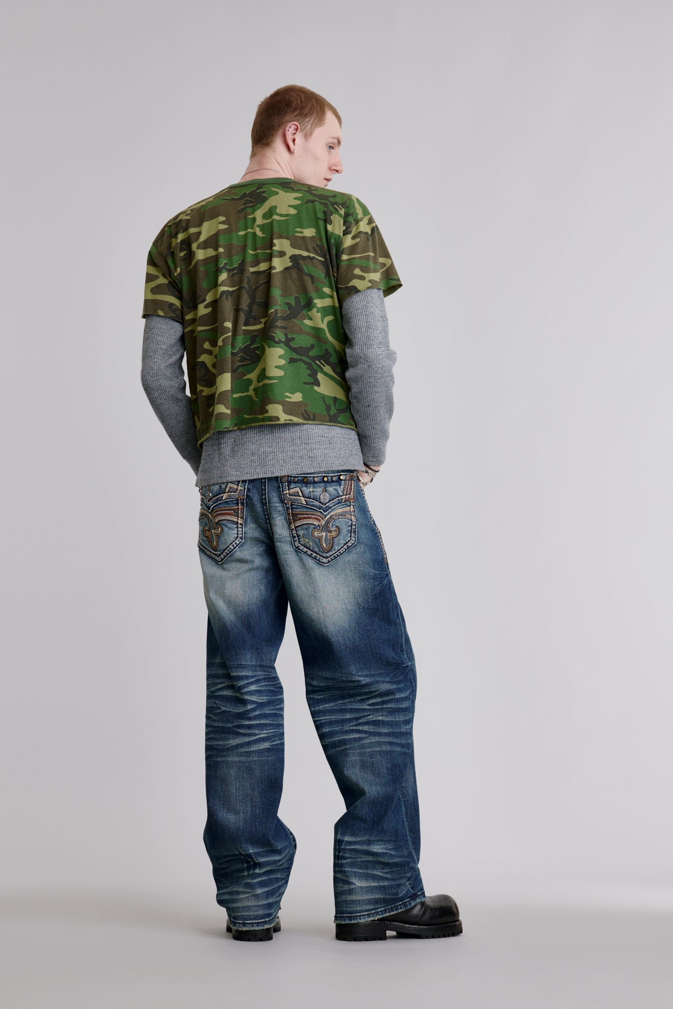 Milton Baggy 2 (Loose Fit) Studded Jeans by Rock Revival feature a wide, baggy silhouette crafted in a dark blue vintage wash with a whiskering, fading, and signature contrast stitching. Designed in Los Angeles for a bold, unisex look.