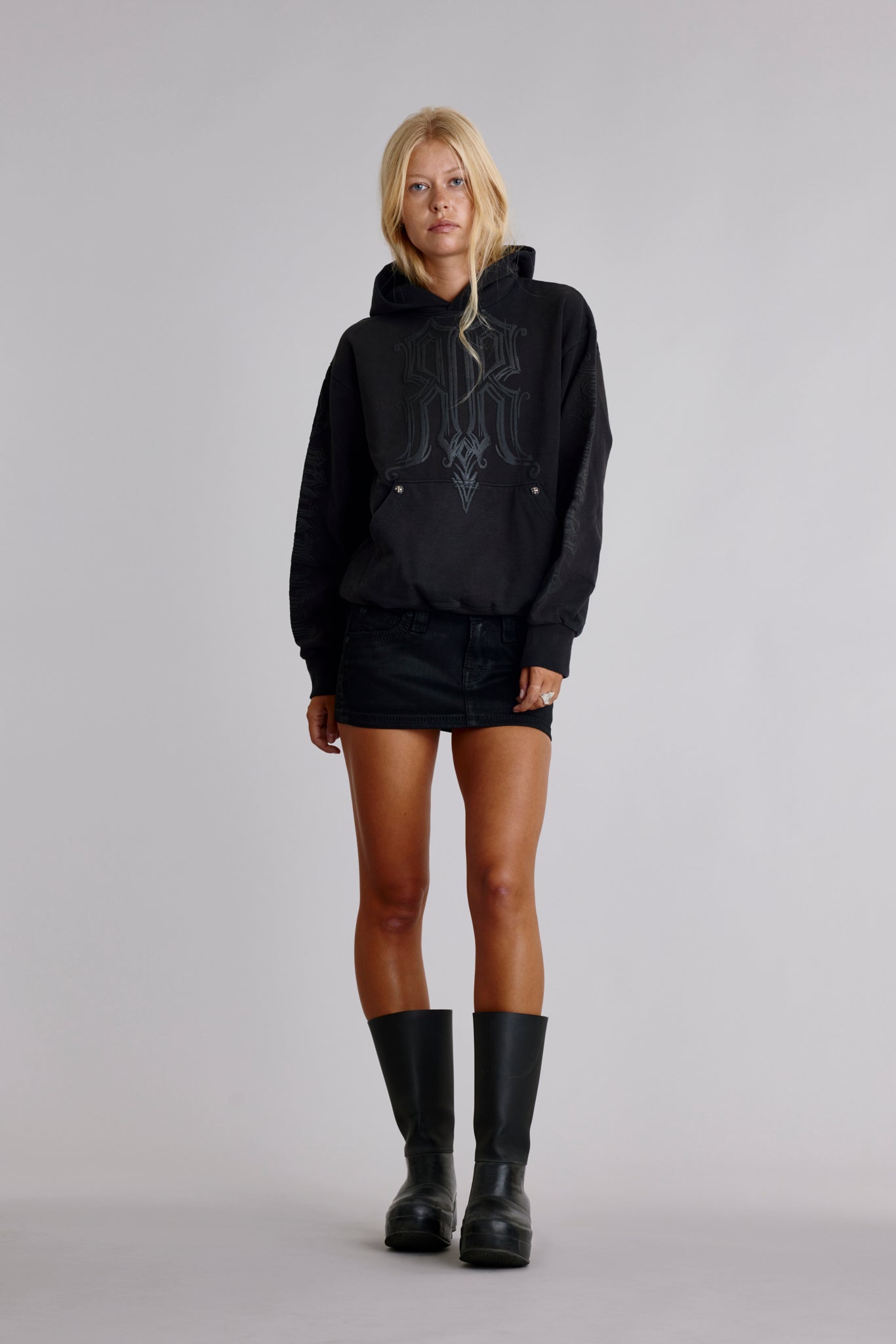 Matte black logo down both sleeves