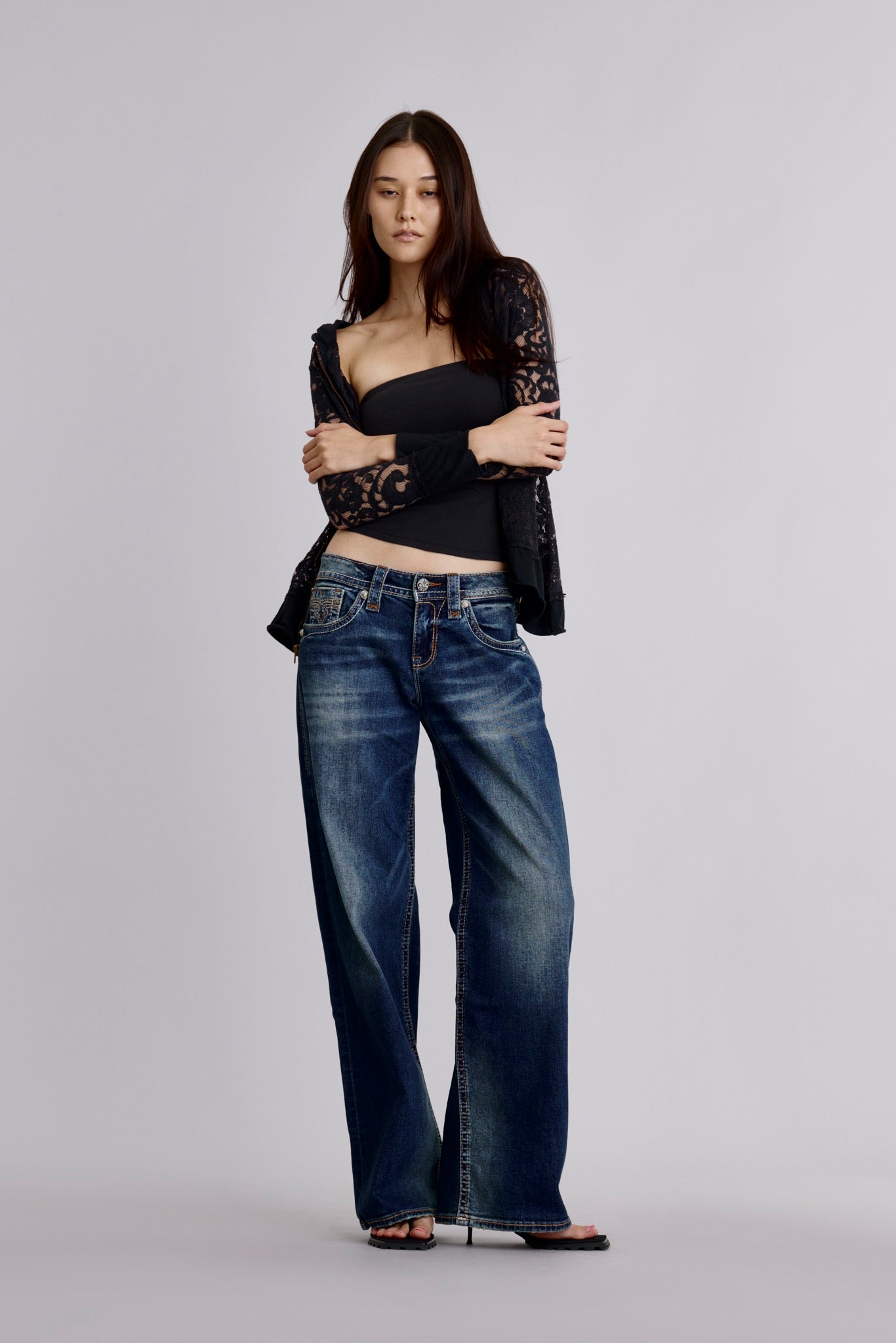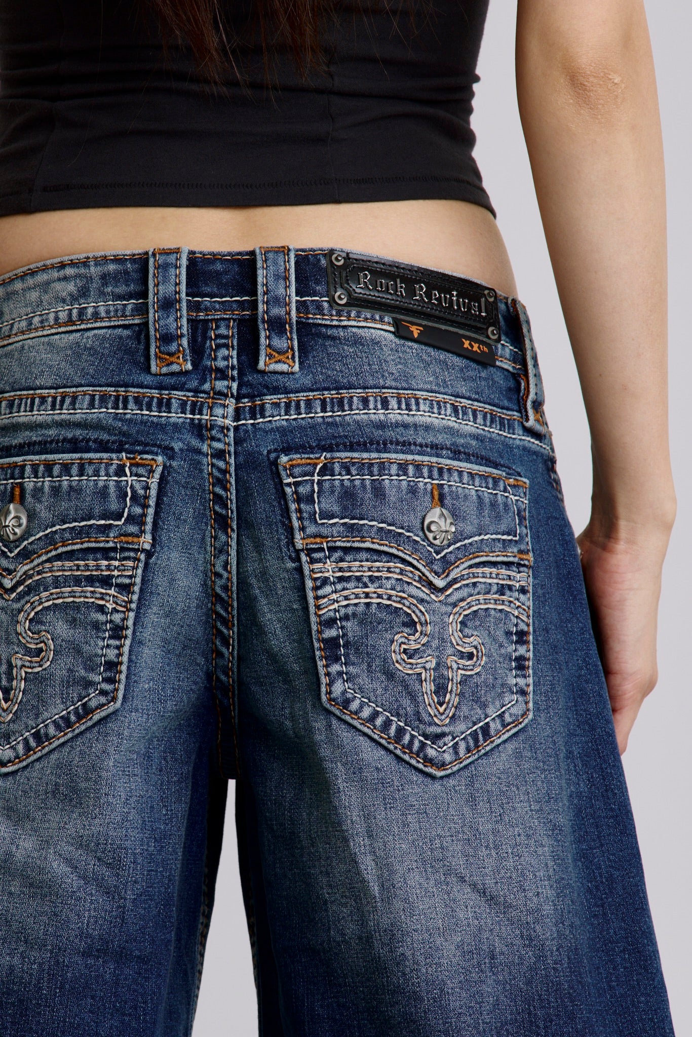Titania Low-Rise Wide-Leg Jeans by Rock Revival feature a clean, wide-leg silhouette crafted in a dark-blue wash and designed in Los Angeles.