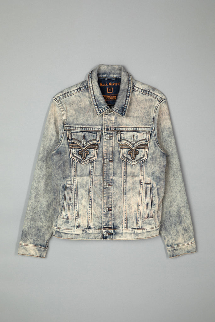 Arther Denim Jacket by Rock Revival crafted in a stonewash, designed in Los Angeles.