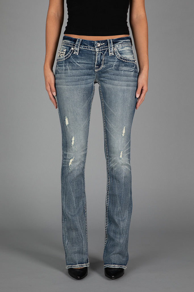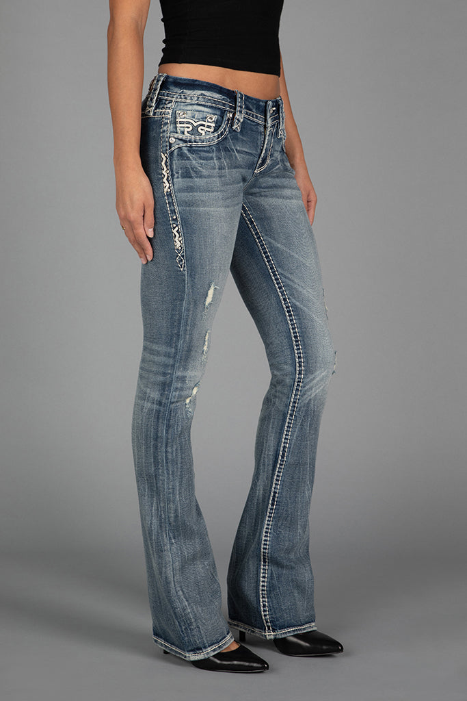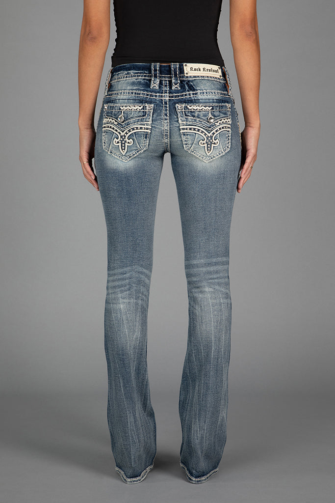 Lesia Low-Rise Bootcut Jeans by Rock Revival features a low rise with a bootcut silhouette crafted in a medium wash, designed in Los Angeles.